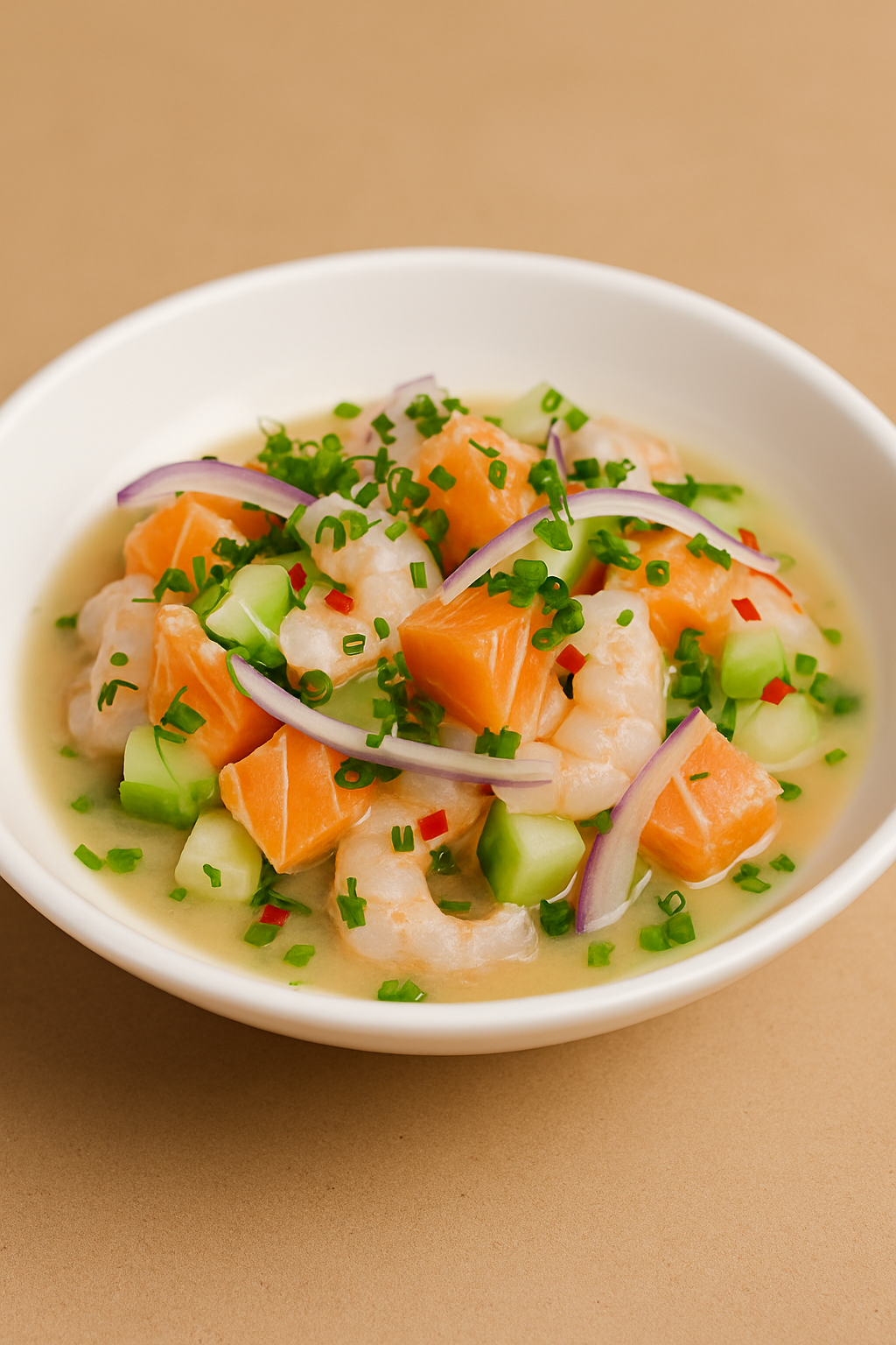 Cubos de salmón y camarón marinados en jugo de limón, con cebolla morada, cilantro fresco, pepino y ají suave.