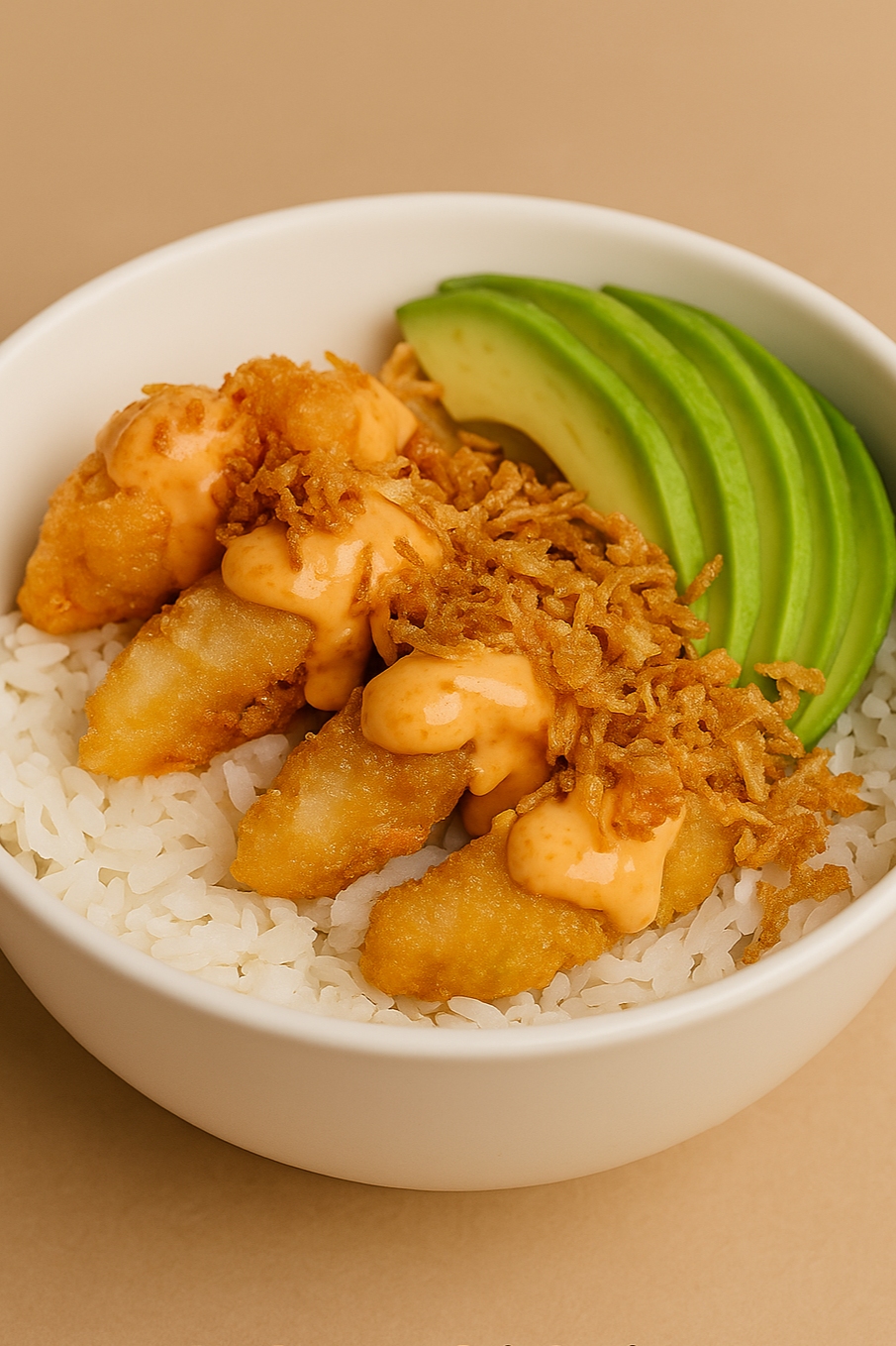 Arroz gohan con camarones tempura, spicy mayo, palta y cebolla crispy. Cremoso y crujiente en cada bocado.
