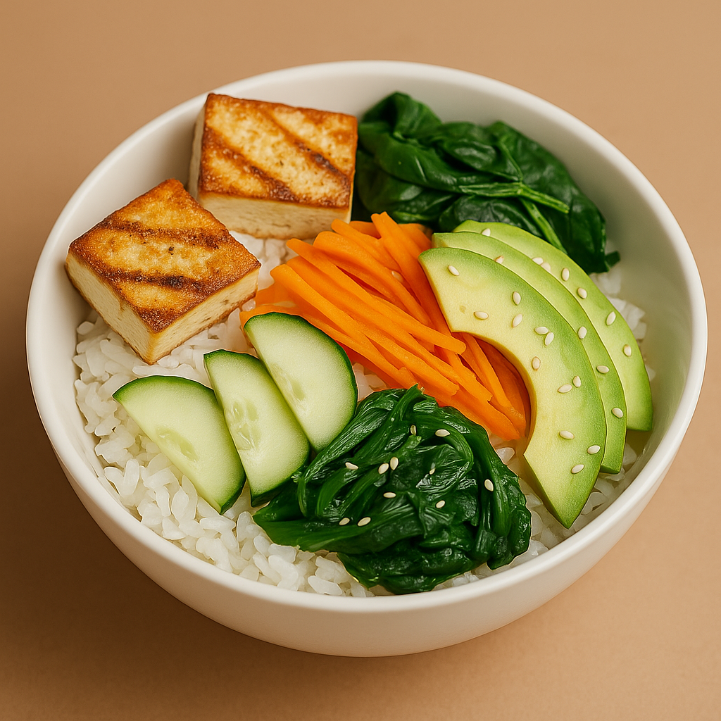Arroz gohan con palta, zanahoria, pepino, espinaca salteada y tofu grillado, con aderezo de sésamo.
