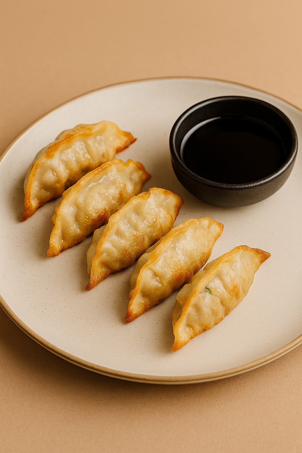 Empanaditas japonesas rellenas de pollo y verduras, doradas a la plancha y acompañadas de salsa ponzu.