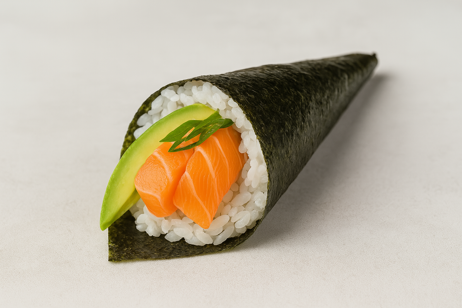 Cono de alga nori relleno de arroz, salmón fresco, palta y cebollín. Una opción simple y sabrosa