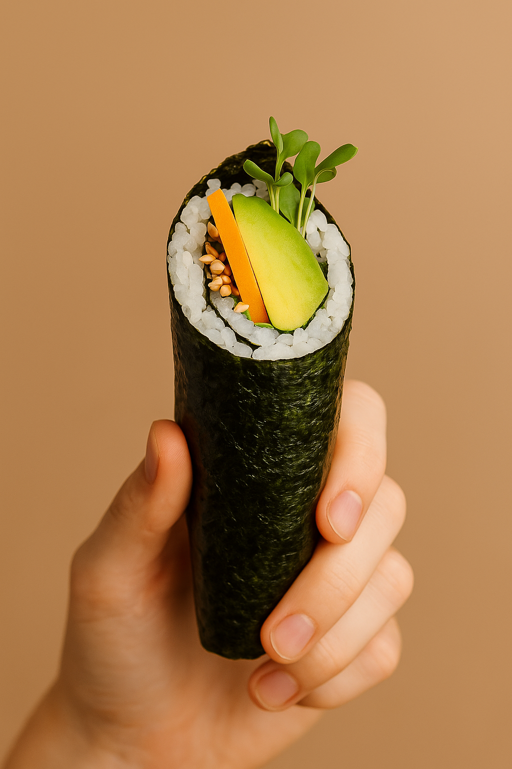 Relleno de arroz, palta, zanahoria y pepino, con sésamo tostado y brotes frescos. Una opción ligera, fresca y 100% vegetal.