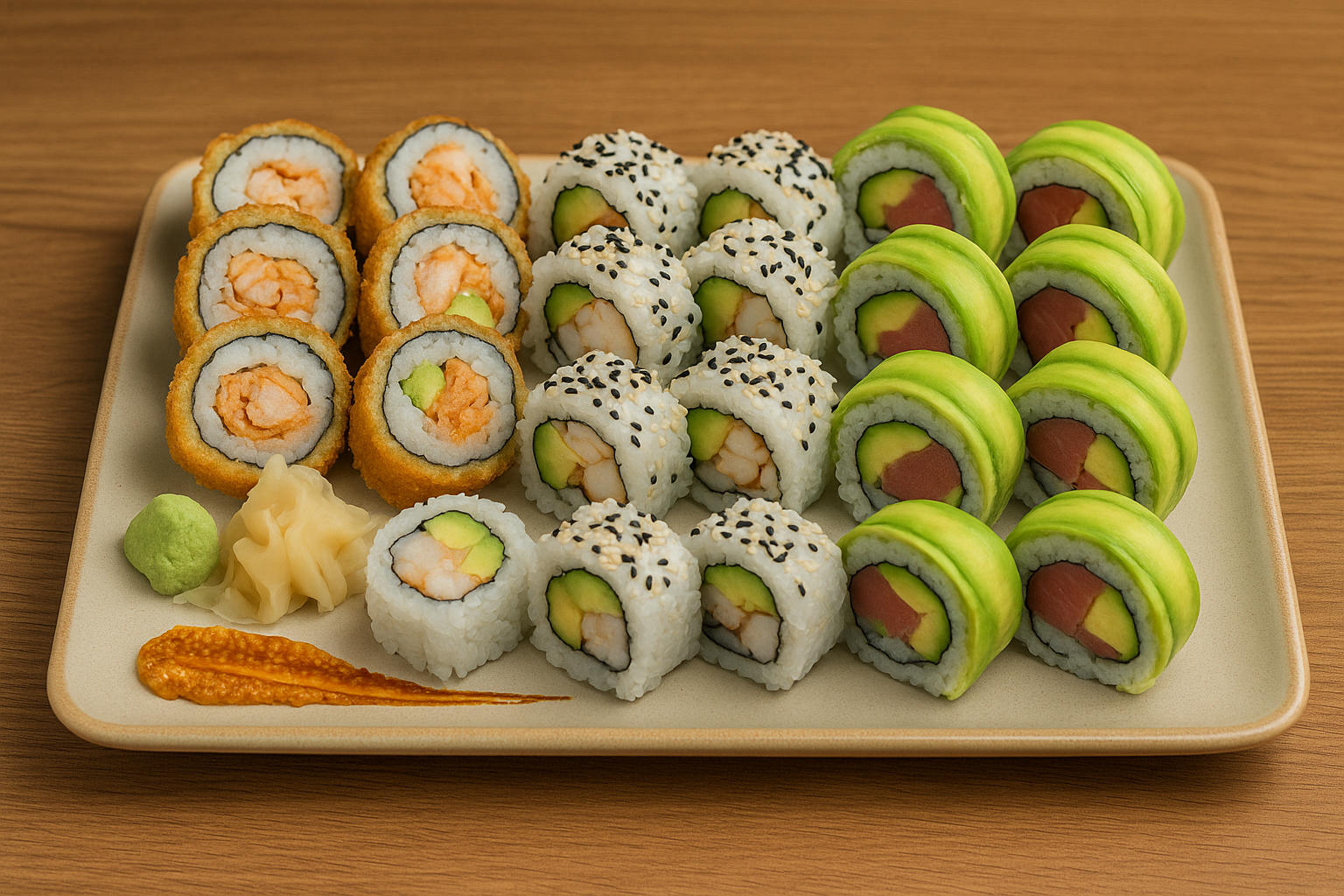 Acompañado de jengibre, wasabi y salsa especial. Ideal para compartir.