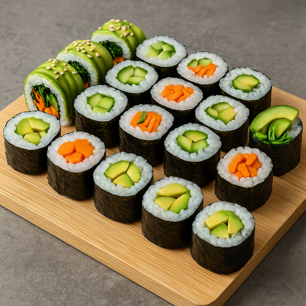 Makis de palta con pepino, hosomakis de zanahoria y uramakis de palta con sésamo negro. Una combinación suave, fresca y balanceada, ideal para los amantes del sushi vegetal.